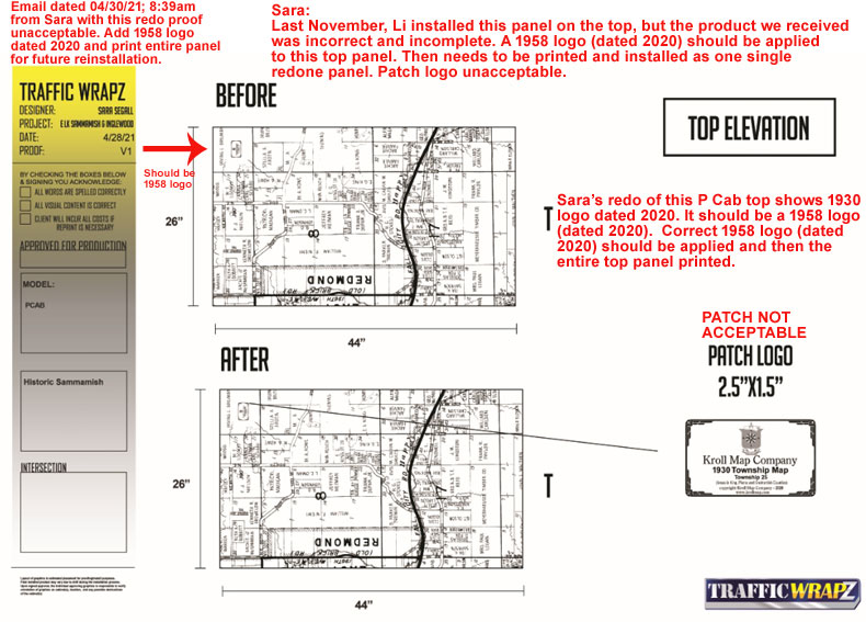 | Below proof comment sent to Sara, but in the redo, she only prepared a 2.5" x 1.5" patch which is unacceptable. I had suggested that she might consider a panel which could be applied to entire lid width of this P cabinet, but she opted to prepare a patch which will not do. Therefore, I have requested the entire panel be redone with the correct 1930 logo (2020 dated version) for future reinstallation. | |||||||||||||||||||||